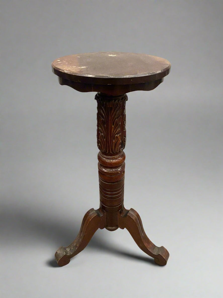 A matching pair of plant display pedestal tables with heavily carved stems.