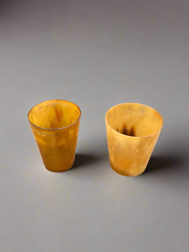 A trio of small, antique, yellow horn shot glasses.