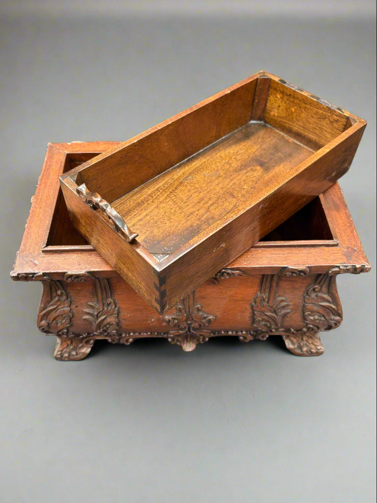 An antique, hand-carved, mahogany tea caddy/chest with ornate scroll details to the body and handle.