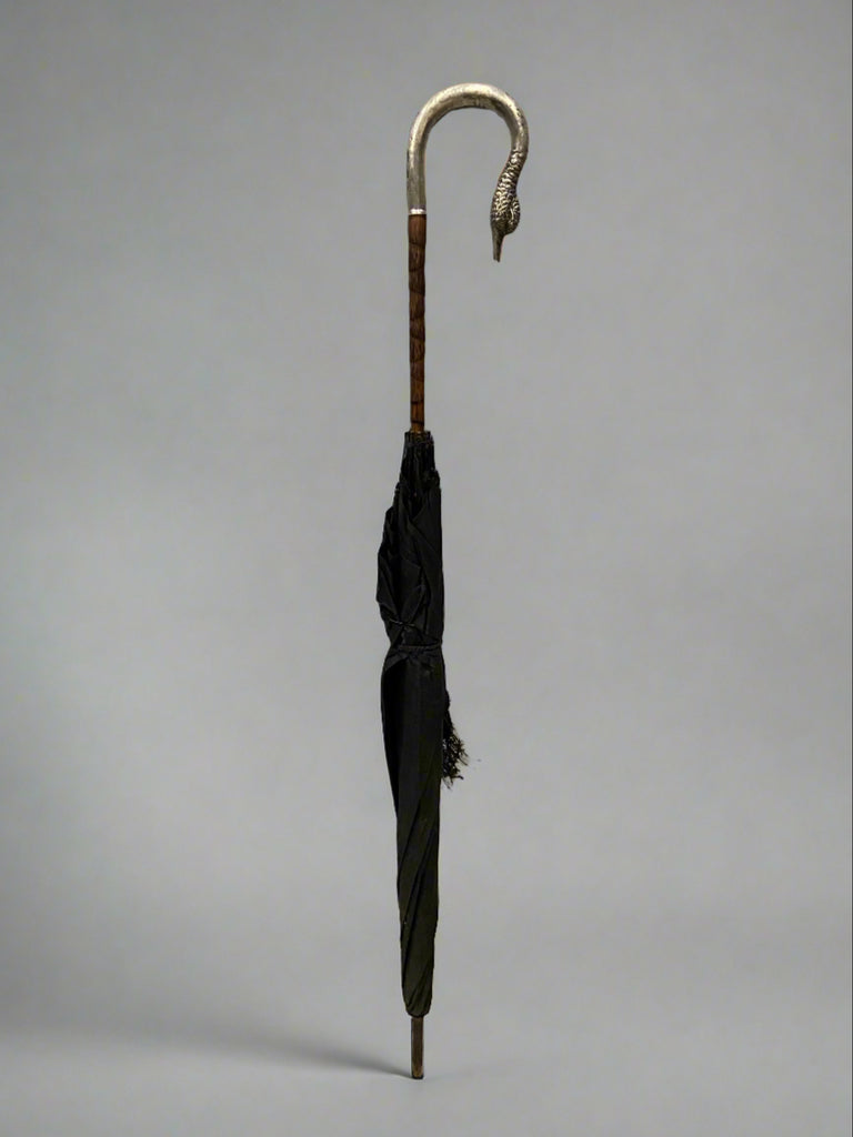 An elegant umbrella with a black parasol and cast silver swan head handle.