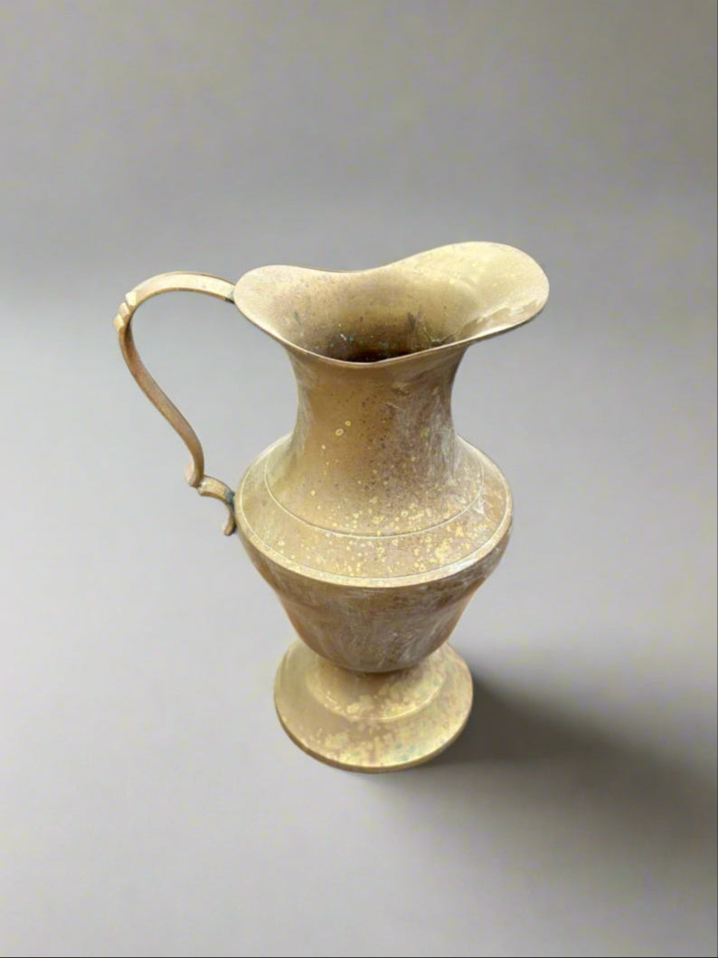 A Victorian brass jug/pitcher with a decorative curved handle and aged speckled spots.