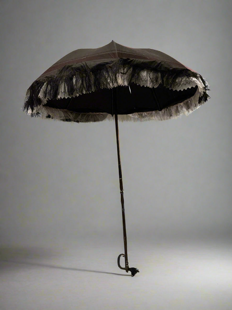 A Victorian black silk mourning parasol with black tassel and white lace fringing.