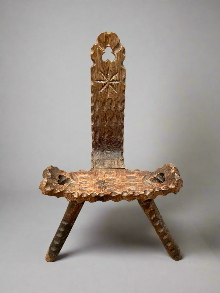 Vintage Spanish wooden birthing chair with tripod legs, circa 1970s.